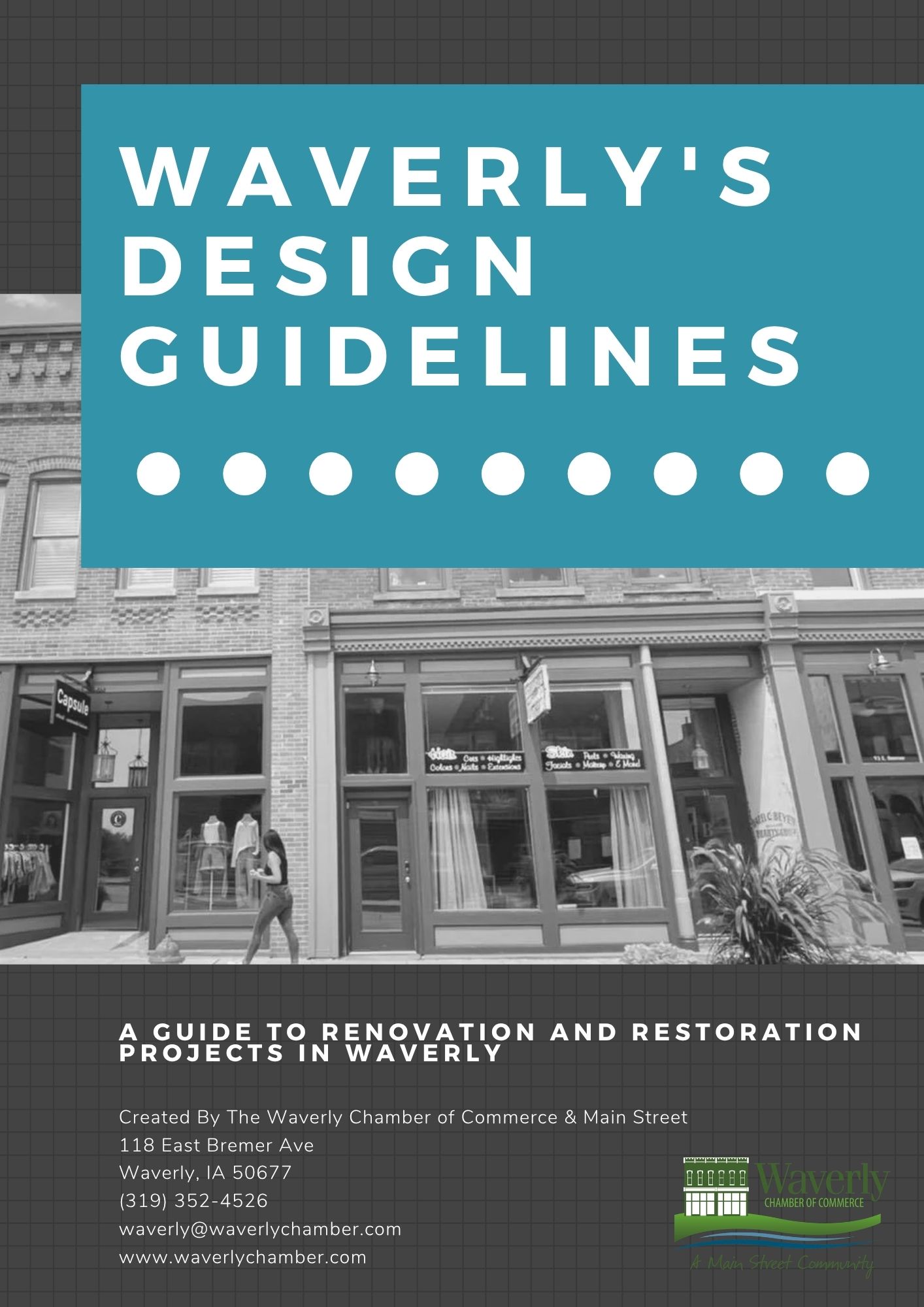 The Waverly Chamber of Commerce Design Committee created this extensive and resourceful Design Guidelines document to assist building and business owners in our historic downtown retail district. This informational resource has been reviewed and approved by the Chamber/Main Street board and Main Street Iowa design staff.
