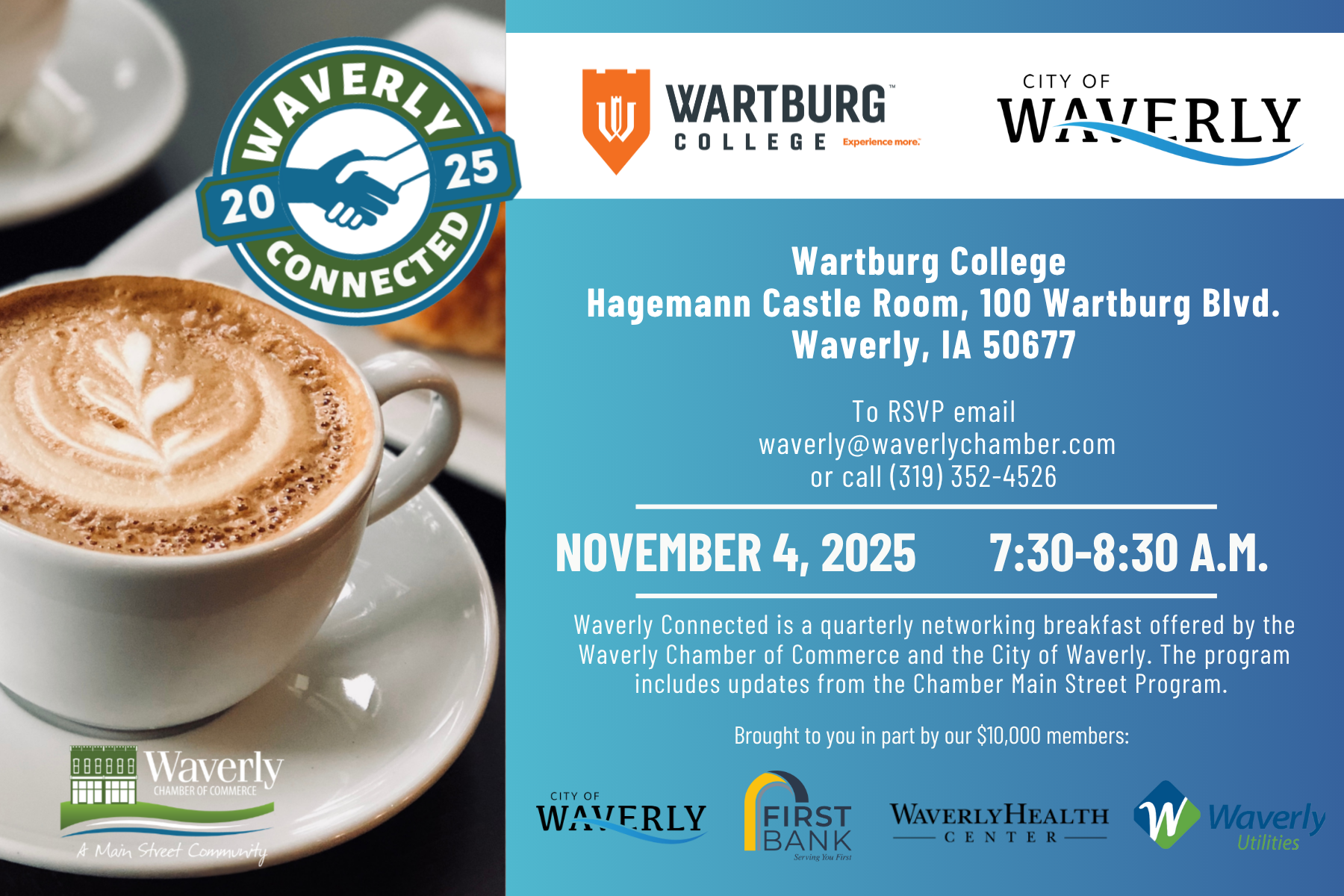 Waverly Connected is a quarterly networking breakfast offered by the Waverly Chamber of Commerce and Waverly Area Economic Development. The program includes updates from the Chamber and Economic Development along with other community business leaders. The events are hosted by Chamber members throughout the community and there is no cost to attend.