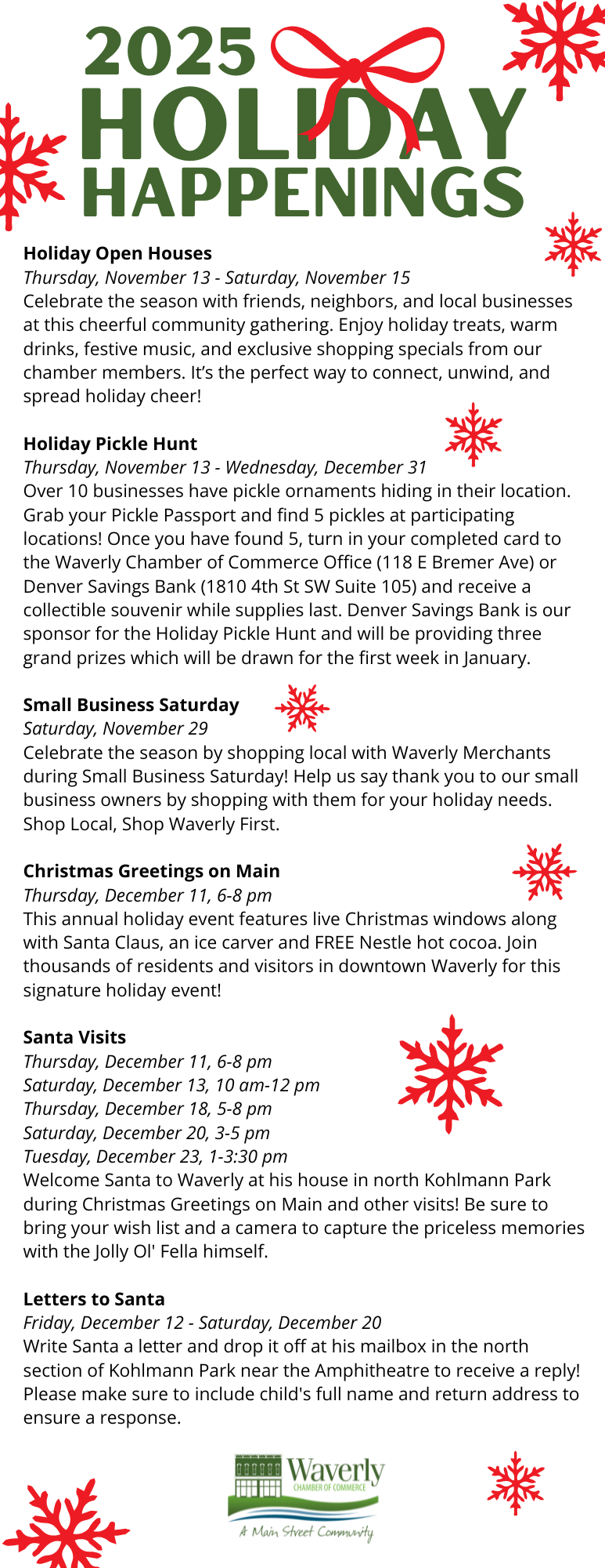 Celebrate the holidays with us in Waverly! This season, we’re highlighting the festive events hosted by the Waverly Chamber of Commerce throughout November and December. Mark your calendars and join us in making the holidays bright with community fun and cheer.