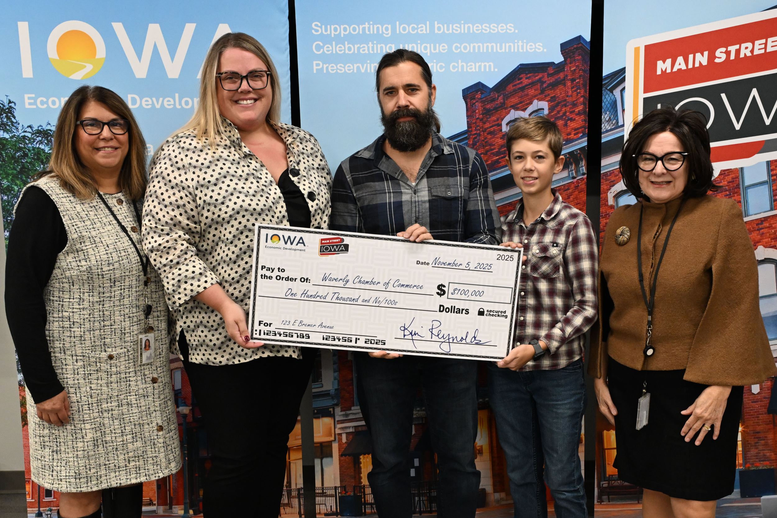 The Waverly Chamber of Commerce & Main Street received $100,000 for the Downtown Dreamers Historic Upper Story Revitalization Project, led by Tim and Rebecca Lalk, which will transform 2,904 square feet of long-vacant second-floor space at 123 E. Bremer Avenue into two modern, two-bedroom market-rate apartments. This redevelopment will add high-quality housing to downtown Waverly, helping to increase foot traffic, support local businesses, and create a more vibrant, active downtown environment. Each new upper-story unit is projected to generate approximately $27,000 in annual economic impact—showcasing the lasting value of reinvestment in Waverly’s historic core. Chelsea Petersen, along with the Lalk family were among those who attended the awards presentation today at IEDA’s office in Des Moines.