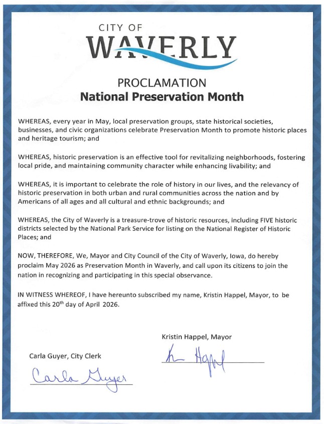Mayor Kristin Happel signed a proclamation during the April 20, 2026, City Council meeting officially designating May as Preservation Month in the City of Waverly. The proclamation recognizes the importance of preserving the community’s historic places and celebrating Waverly’s cultural heritage.